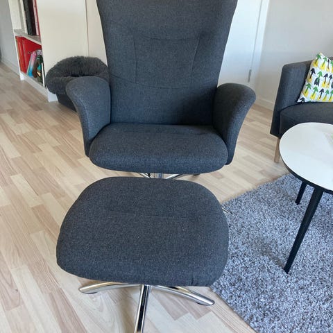 Lænestol i gråt stofbetræk. Stolen har høj ryg, polstrede armlæn og indbygget vippe- og fodstøttefunktion, der justeres med håndtag i siden. Understel i metal med drejefod. Egnet som hvilestol i stue eller læsehjørne. Designet til én person og udført i tekstil med synlige søm og enkel, moderne form.
