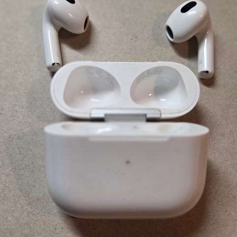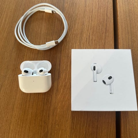 Apple AirPods 3. generation trådløse høretelefoner med MagSafe charging case. Modellen leveres Høretelefonerne er in-ear og forbindes trådløst til kompatible enheder via Bluetooth.
