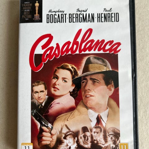 Casablanca dvd 85 års jubilæumsudgave. Udgivelse af spillefilmen Casablanca på dvd. Forsiden angiver 85 years-jubilæumsudgave. Bagsiden viser, at filmen er distribueret af Warner Bros. Entertainment Danmark ApS og har aldersmærkning med grøn trekant. Standard dvd-plastcover med trykt omslagstekst og billedmateriale på både for- og bagside.