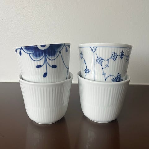 Musselmalet Halvblonde kaffekopper med underkopper hvid blå porcelæn