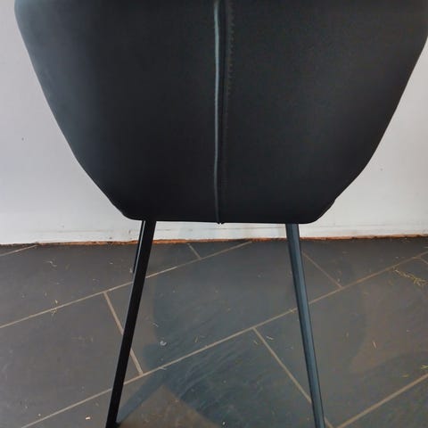 Ilva spisebordsstol. Stolen har sort sæde og ryg i kunstlæder og slanke ben i metal. Egnet som spisebordsstol i køkken eller spisestue. Enkel, moderne form med let buet ryg for støtte. Overfladen er i kunstlæder, som kan tørres af med en fugtig klud ved rengøring.