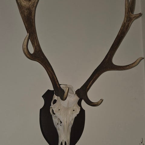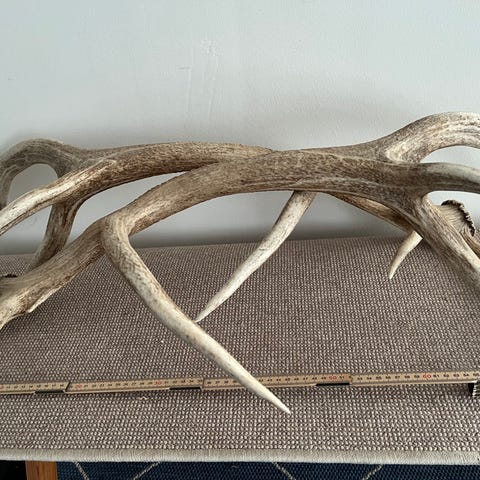 Gevir af 12-ender kronhjort. Et sæt meget flotte kastestænger af kronhjort fra egen farm. Et sjælden flot sæt til dekoration!