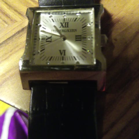 Guess herreur med rund urskive og sort læderrem. Uret har lys urskive med store talmarkeringer ved 12 og 6 samt minut- og timeviser. Rammen omkring urskiven er besat med sten, der danner en dekorativ kant. Uret er designet til mænd og bæres med traditionel spænde-lukning på remmen.