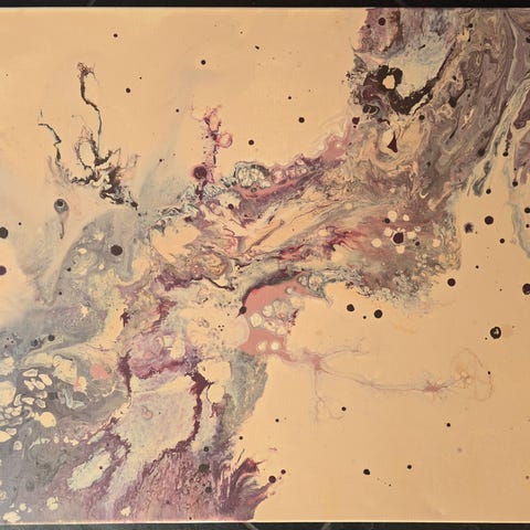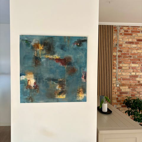 Abstrakt akrylmaleri på lærred i flerfarvede nuancer og mange lag.