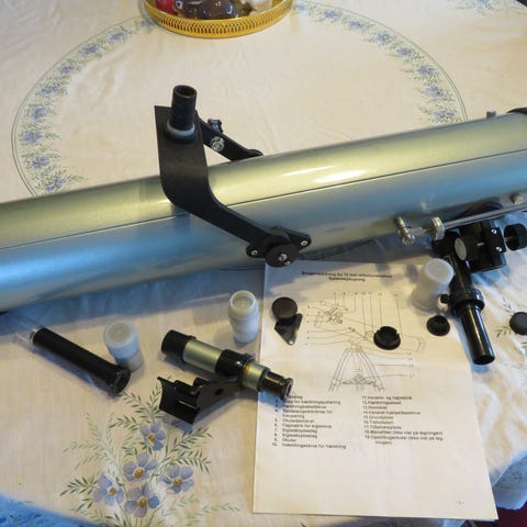Telescope stjernekikkert med stativ. Klassisk rørformet teleskop monteret på justerbart trefodsstativ. Egnet til observation af nattehimlen, f.eks. månen og større himmellegemer. Leveres i original emballage som vist på billedet.