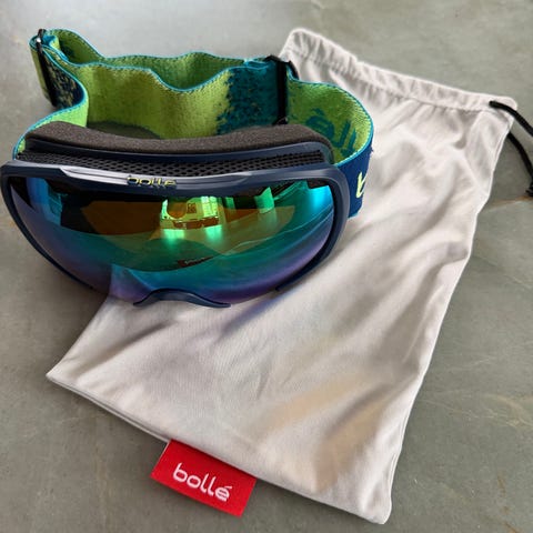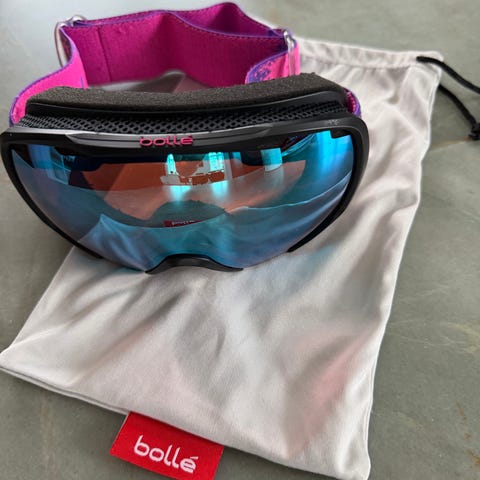 Bollé skibriller med grøn elastikrem og rødtonet linse. Brillerne har skumkant for komfort omkring ansigtet og justerbar rem, så de kan tilpasses hovedstørrelse eller hjelm. Medfølgende blød opbevaringspose, der også kan bruges til at tørre linsen forsigtigt af. Velegnet til ski og snowboard.