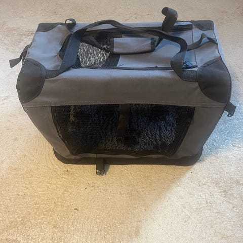 Rigtig god transporttaske, som kan foldes sammen. Brugt til 1 Golden Retriever hvalp. Længe 71 cm, højde og bredde 51 cm.