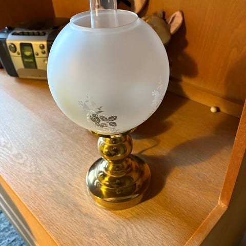 Flot lampe i messing med glas kuppel. Afbryder på ledningen. Måler 40 cm i højden og kuplen er 18,5 cm i diameter.