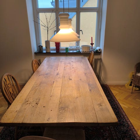 Træ spisebord i rektangulær form i naturfarvet træ. Bordet har drejede ben og en enkel, klassisk stil, der egner sig til brug i køkken eller spisestue. Velegnet som spisebord til hverdag eller som ekstra bord ved større selskaber. Selve bordet er 178cm og der er 2 stk 45 cm plader der ligger under bordet, så bordet kan blive ca 266 cm i fuld længde. Bordet står lige nu i Saltum men kan også leveres i Hobro hvis det kunne være til nogen hjælp.