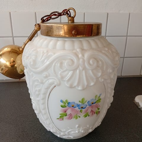 Antik lampe med hvidt glas og dekorative blomster- og sommerfuglemotiver. Lampen består af to dele, der kan skilles ad. Glasdelen har detaljerede mønstre og farverige blomster i røde og grønne nuancer samt sommerfugle. Lampen har en messingfarvet top og kæde til ophæng.