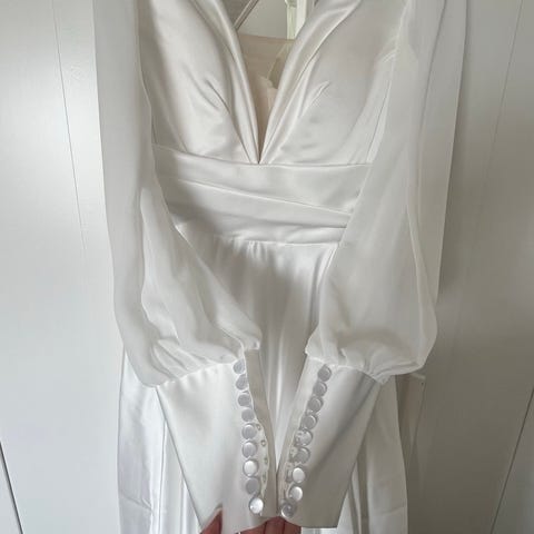 Kjolen har en dyb V-udskæring med perlebroderi og en let, luftig bund i tyl.