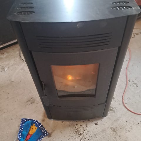Extraflame Lisa Plus pilleovn i orange med sort front. Ovnen er beregnet til træpiller og har frontvindue til indsyn til flammen. Bagpå findes typeskilt med modelbetegnelse Lisa Plus og tekniske data i henhold til EN 14785:2006. Ovnen er egnet som varmekilde i bolig og tilsluttes eksisterende skorsten eller røgrør via udgang på bagsiden. Designet er fritstående med metalbeklædning og betjeningspanel øverst. Pilleovnen står i Saltum i et sommerhus men kan komme til Hobro såfremt det ønskes.