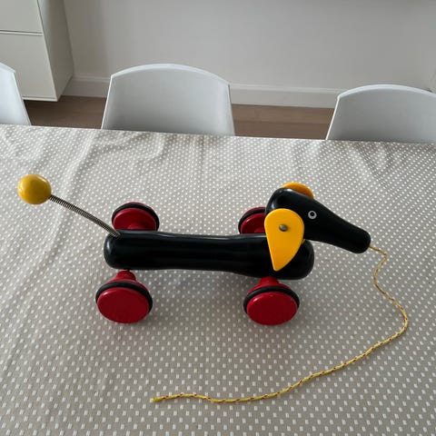 BRIO træhund som træklegetøj i træ. Legetøjet har snor foran, fire røde hjul og bevægelige dele i sort og gul. Egnet som klassisk trækdyr til mindre børn, der kan trækkes hen over gulvet.