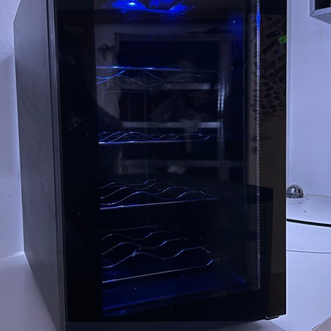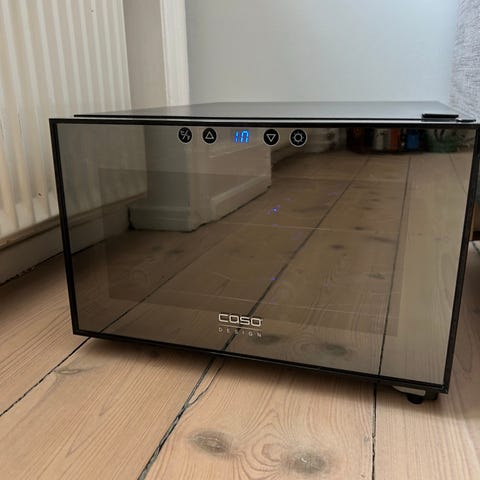 Lækkert skab med plads til 12 flasker. Data, herunder mål, fremgår af foto. Der medfølger nøgle til skabet. Lys kan slukkes. Nypris ca. 2800 kr.