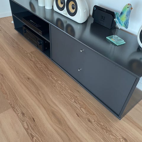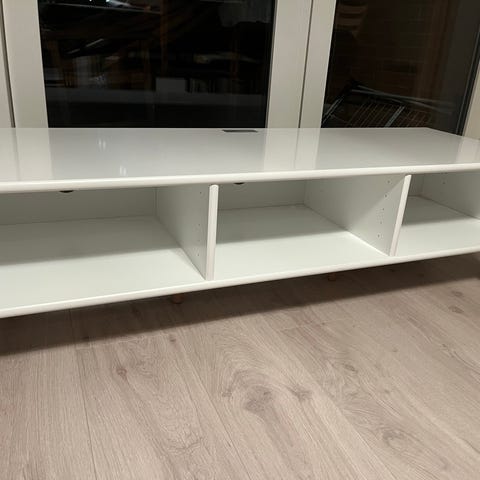 Hvid Mistral TV møbel. Super fint, kun få brugsspor, kommer fra ikke ryger hjem. Der er boret et hul til ledninger, bagerst i det åbne rum.