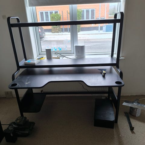 Gamer skrivebord fra IKEA, ingen synlige slid. Der har siddet en lys skinne på undersiden af en hylde, så små skruehuller.