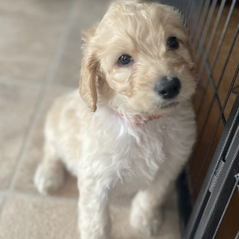 Vilde (lys gylden) på 15 kg venter hvalpe 19. marts. Vilde er double doodle, blanding af goldendoodle (mor) og labradoodle (far). Vilde er den blideste og kærligste hund med et utroligt mildt sind og meget lærenem. Vi har selv Vildes far også. Kuldets far er Marlo, harlekin tysk kongepuddel på 21 kg med stamtavle. Han er sød, kærlig og en rigtig puttegøj. Begge forældre er røntgenfotograferet og testet ud fra DKK anbefalinger.