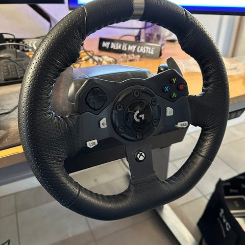 Logitech G920 rat og pedaler med separat gearstang til racing- og køresimulation. Sættet består af rat med knapper, trepedalsenhed med kobling, bremse og speeder samt manuel gearstang monteret på stativ. Egnet til brug med kompatible spillekonsoller eller pc til bilspil og køresimulatorer. Farve hovedsageligt sort med metaldetaljer på pedalerne.