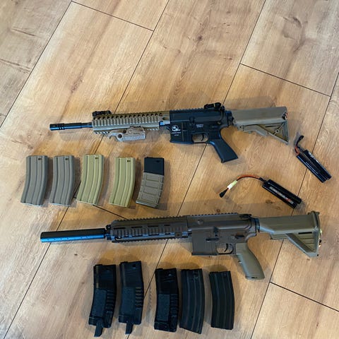 M4 gevær der sider nye dele i som titan gearkasse, præcisions løb og andet el (kan ikke huske hvad det hed) mangler batteri da cellerne døde