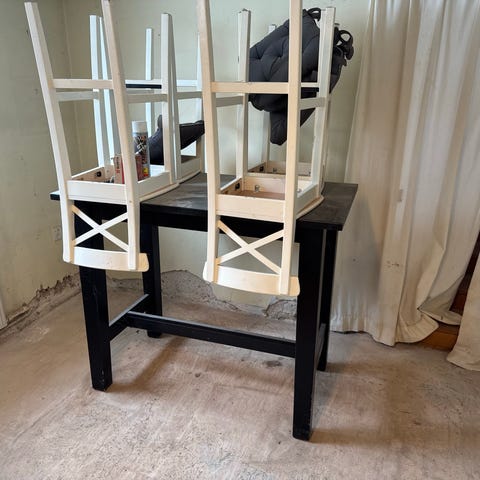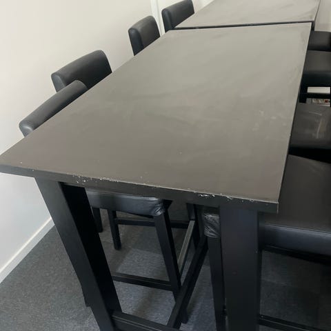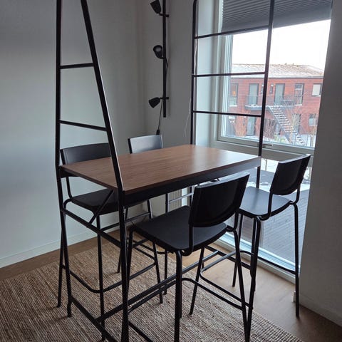 Højt bord med to tilhørende stole til, med grå sæder. Har lidt småridser som man kun kan se tæt på.