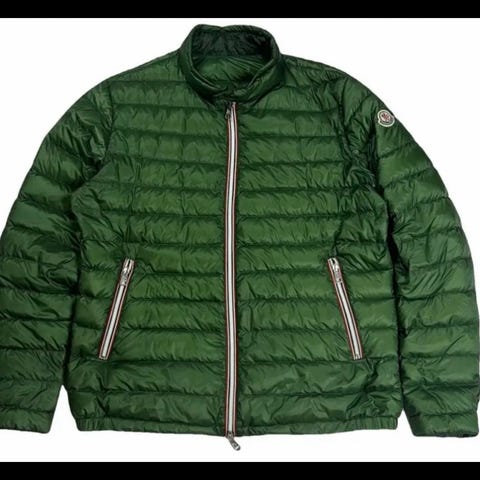 Moncler dunjakke til herre i størrelse L. Jakken er blå og fyldt med dun. Den har gennemgående lynlås på fronten, ribkanter ved hals, ærmer og nederst samt sidelommer med lukning. På ærmet ses et markant rødt og hvidt logo-detalje. Velegnet som let og varm overgangs- eller hverdagsjakke.