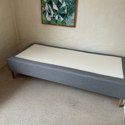 Jysk boxmadras med topmadras i størrelsen ca. 90x200 cm. Boxmadrassen har mørkegråt stofbetræk og runde metalben. Topmadrassen er hvid med quiltet overflade. Velegnet som enkeltseng i soveværelse, gæsteværelse eller ungdomsværelse. Der ses en mindre skade i stoffet på siden af sengen, som vist på billedet.