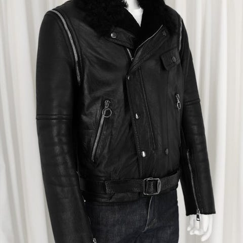 Gucci jakke til herre i str. 52. Jakken er fremstillet i sort læder med struktureret overflade på dele af front og ærmer. Den har lynlås foran, to frontlommer med lynlås samt ribkanter ved hals, ærmer og nederst, med karakteristiske stribedetaljer. Velegnet som yderjakke i overgangssæsoner og til hverdagsbrug.