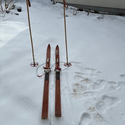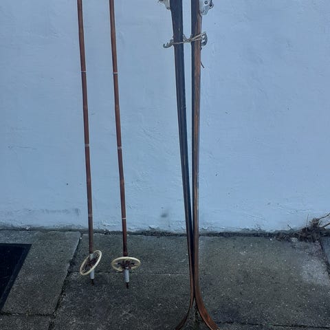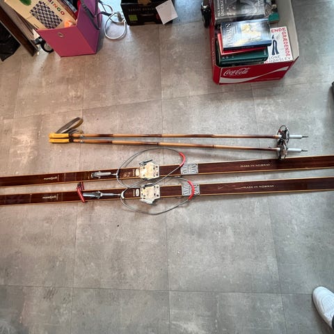 Landsem turski i træ med klassisk rød/gul dekoration. Skien er fremstillet i Norge og har monteret traditionel binding. Egnet som langrendsski eller turski, eventuelt også til dekoration eller samling af ældre skiudstyr.