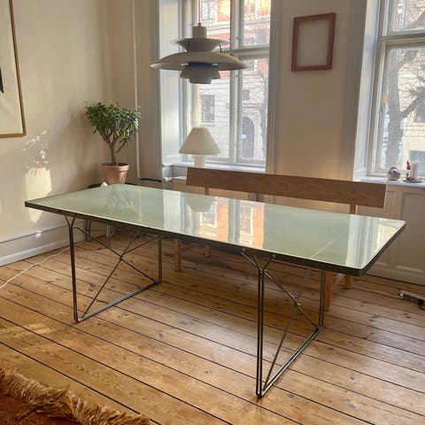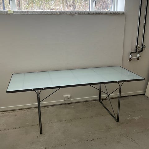 Moment spisebord fra IKEA i matteret glas og grå stålramme og ben. Designet af Niels Gammelgaard.
