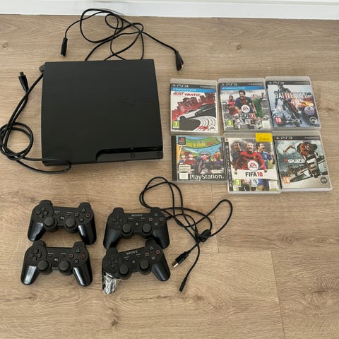 Sony Playstation 3 konsol i sort. På billedet ses selve PS3-konsollen sammen med to trådløse controllere og tilhørende kabler. Konsollen er egnet til afspilning af Playstation 3-spil samt multimediebrug som film og musik, afhængigt af tilslutning og opsætning. Velegnet til brug i stue eller værelse med kompatibel skærm eller tv via relevant videokabel.