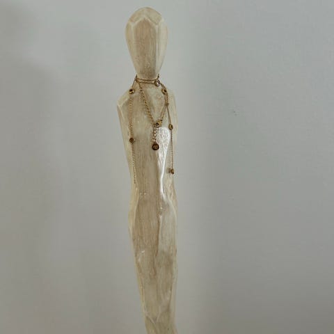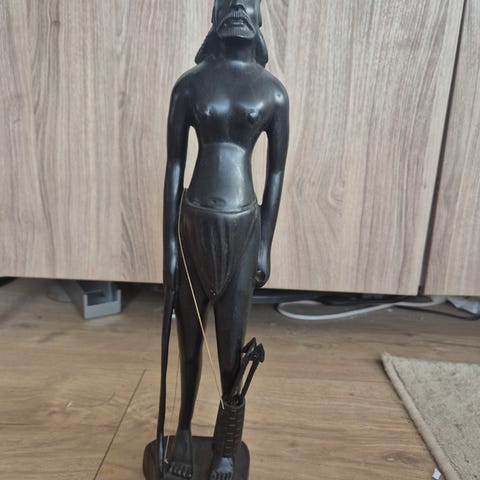 Dekorativ skulptur i form af en siddende figur udført i mørkt træ. Figuren holder en vandret stav mellem hænderne og har udskårne ansigtstræk med markante øjne og tænder. Om halsen og armene ses farvede smykker eller snore som ekstra detaljer. Skulpturen kan anvendes som dekorativ genstand i boligindretning, f.eks. på hylde, bord eller reol. Velegnet til samlere af træfigurer eller som et særpræget indslag i indretningen.