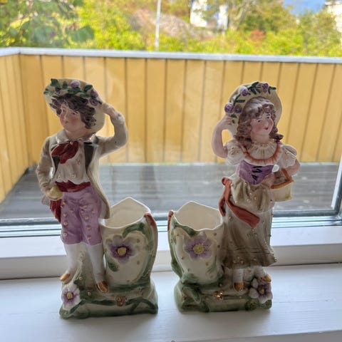 Porcelænsfigur - rokokko-agtig med fine farver - blå jakke, lyserøde bukser, grøn hat. Har kun stået til pynt i en etagére i en stadsstue i et hus i Sverige de sidste mindst 60 år. Uden skår eller lign.