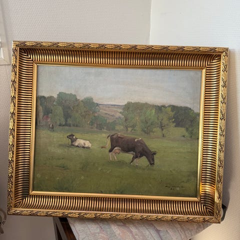 Gunnar Flyvholm maleri udført som olie på lærred med motiv af to køer på græs i et åbent landskab med marker, bakker og træer i baggrunden. Maleriet er monteret i en træramme. Bagsiden viser lærred opspændt på en træblindramme med ophængswire. Det skulle efter sigende være den originale ramme.