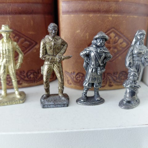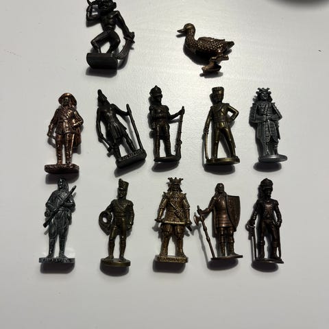 Jeg sælger denne samling af 7 detaljerede metalfigurer (messing/kobber-finish), som primært stammer fra de klassiske Kinder Surprise-serier fra 90'erne. Figurerne er i normalt stand med en flot, naturlig patina.