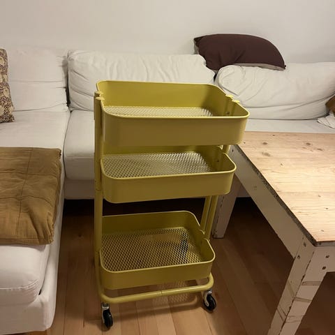 IKEA Råskog rullebord/rullevogn med 3 hylder i hvidlakeret metal. Brugt til skrivebordsopbevaring på børneværelse.