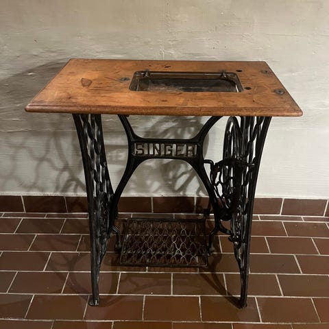 Singer bord med kraftig marmorplade og sort støbejernsunderstel. Bordpladen har marmoreret mønster i grå og hvide nuancer. Understellet er et tidligere symaskine-stel med trædeplade bevaret som dekorativ detalje. Velegnet som sidebord, konsolbord eller lille arbejdsbord i fx stue, entre eller køkken. Klassisk kombination af marmor og støbejern med tydeligt Singer-logo i understellet.
