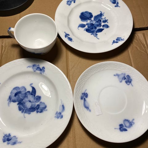 Royal Copenhagen - Blå blomst 1. Sortering. Porcelænsstel i hvid med blå blomstermotiv. Sættet omfatter forskellige dele, blandt andet tallerken, fad, skål og sukkerskål med låg og hanke. Dekorationen består af blå blomster og ornamenter på hvid baggrund. Velegnet som kaffestel eller serveringsstel i hjemmet eller til samling af klassisk porcelæn med blå/hvid dekoration.