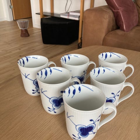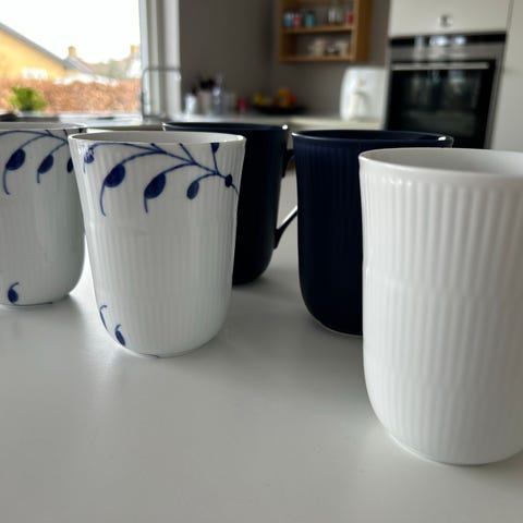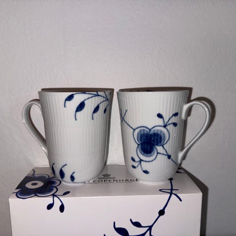 Royal Copenhagen krus i hvid porcelæn med blå dekoration. Sættet består af fire krus med hank. Krusene har rillet struktur og klassisk blå bemaling på ydersiden. Velegnet til fx kaffe, te eller andre varme drikke i køkken og spisestue.