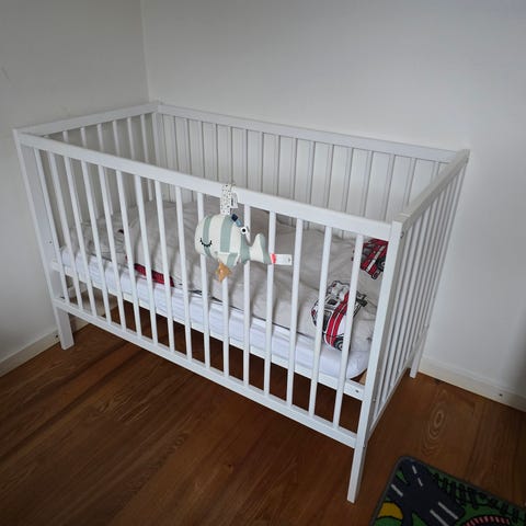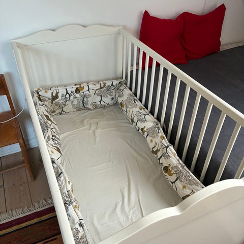 Tremmeseng med hjul som har justerbare madrasbund kan indstilles i flere højder, og hjulene gør det nemt at flytte sengen mellem værelserne, når det er nødvendigt. Sengemål 60x120 cm. og sælges med madras, lagen, sengerand, dyne og sengetøj.