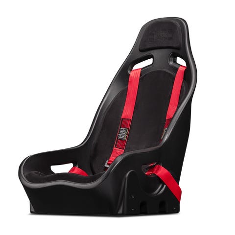 Next level Racing F-GT racingsimulator sæde i sort kunstlæder. Sædet er udformet som et racersæde med høj ryg og polstret sidde- og rygflade. Stellet er i metal med justerbar ramme til montering af rat og pedaler. Velegnet til brug med racingspil og simracing-udstyr i hjemmet. Rat og pedaler på billederne kan medfølge.