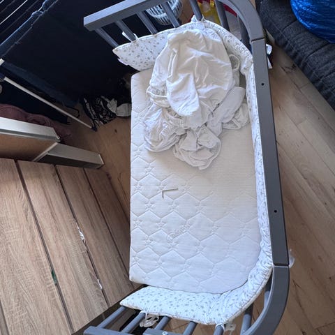 Maxi Cosi sidebed / Bedside crib i lysegrå og mørkegrå.