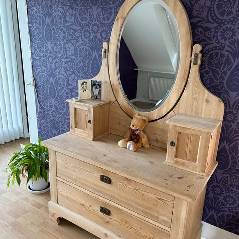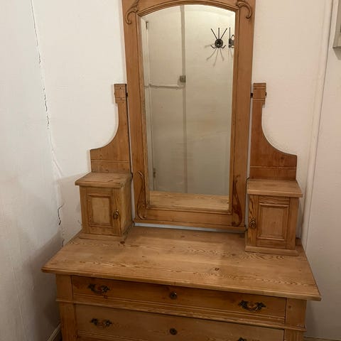 Møblet er velegnet som toiletspejl, sminkebord eller opbevaringsmøbel i soveværelse eller entré.