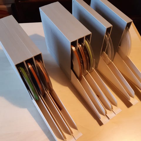Ukendt mærke blandede spolebånd. Kassen indeholder forskellige typer bånd i plastkassetter samt et antal åbne spolebånd.