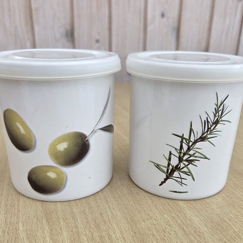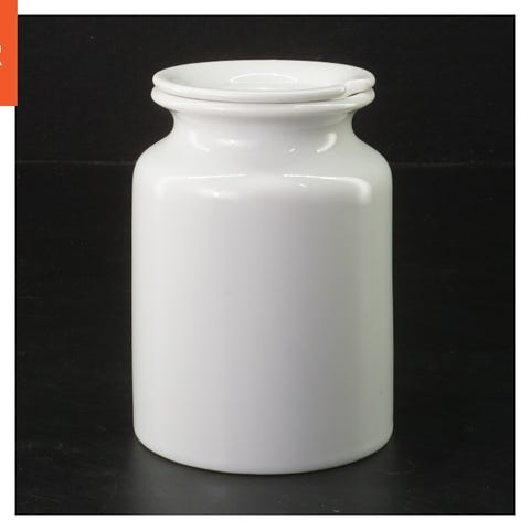 opbevaringskrukker med låg i hvid keramik med grafisk mønster og låg i lyst træ. Krukkerne egner sig til opbevaring i køkkenet, f.eks. tørvarer eller køkkenredskaber. Sælges som sæt med to ens krukker.
