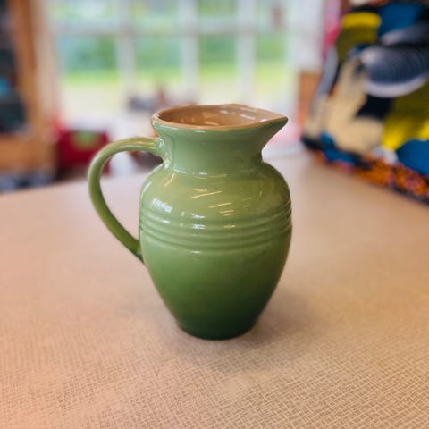 Kanden har en rund form og en udtrækkelig tud. Den er glaseret og lavet af keramik.