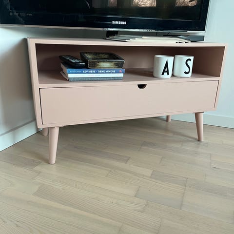 Skabet har træramme med glasdøre og hylder indeni. Det er monteret på små hjul.,Afhentes i:,Røde Kors Kolding (621),Bemærk at mail, chat og beskeder ikke besvares, og varen skal købes på knappen "Gå til varen"