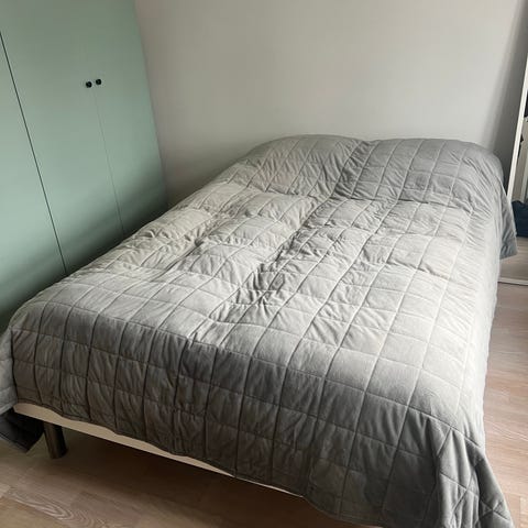 Madrassen har en quiltet hvid overflade og en mørkeblå kant. Den har håndtag og en stabil basis.,Afhentes i:,Røde Kors Kolding (621),Bemærk at mail, chat og beskeder ikke besvares, og varen skal købes på knappen "Gå til varen"