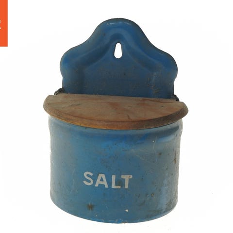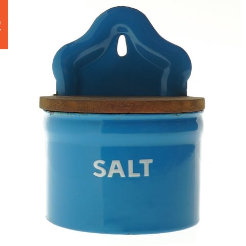 Produktet er en saltbeholder med en blå metaloverflade og et trælåg. Der står "SALT" på fronten.,Afhentes i:,Røde Kors Kolding (621),Bemærk at mail, chat og beskeder ikke besvares, og varen skal købes på knappen "Gå til varen"