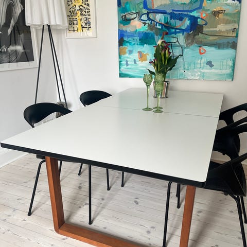 Spisebord med 8 stole og to ekstra plader. 6 - 10 personer. Enkelte brugsmærker.