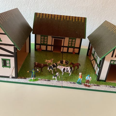 Træ bondegård legetøjssæt med to stalde og små plastdyr. Sættet består af to bygninger i træ med røde tage og malede detaljer på væggene. Der medfølger flere bondegårdsdyr i plastik, blandt andet køer, æsler og grise. Bygningerne har åbne sider og porte, så dyrene kan placeres indenfor. Egnet som rolleleg for børn, der leger bondegård. Nogle kanter på tagene viser tegn på brug.